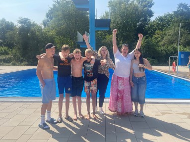 Gleich am zweiten Schultag konnten die Schülerinnen und Schüler der Klassen 6 bis 10 einen gemeinsamen Schulausflug ins Aggua Troisdorf machen. Hintergrund war ein Gewinnspiel, an dem unsere Schule vor den Sommerferien teilgenommen hatte und für das einige Schüler*innen unserer Schule mit Unterstützung durch Frau Rosenau und Frau Graf einen kleinen selbstgedrehten Film auf den sozialen Medien hochgeladen hatten. Zusammen mit dem Kardinal-Frings-Gymnasium erhielten wir die meisten Stimmen und konnten uns über einen kostenlosen Ausflug ins Aggua mit der ganzen Schule freuen. " Ich wünschte, Schule wäre immer so", sagten zahlreiche Schüler*innen, die bei strahlendem Sonnenschein aufgeregt auf das Öffnen des Schwimmbadtores warteten. Zeitgleich dazu wurden die Schüler*innen der drei neuen Klassen 5 eingeschult. Nach einem schönen ökumenischen Gottesdienst wurden sie mit ihren Eltern, Verwandten und Geschwistern in der Aula begrüßt und verbrachten anschließend Zeit mit den Klassenleitungen, während die Eltern Informationen der Schulleitung erhielten und sich anschließend in der Mensa stärken konnten.
