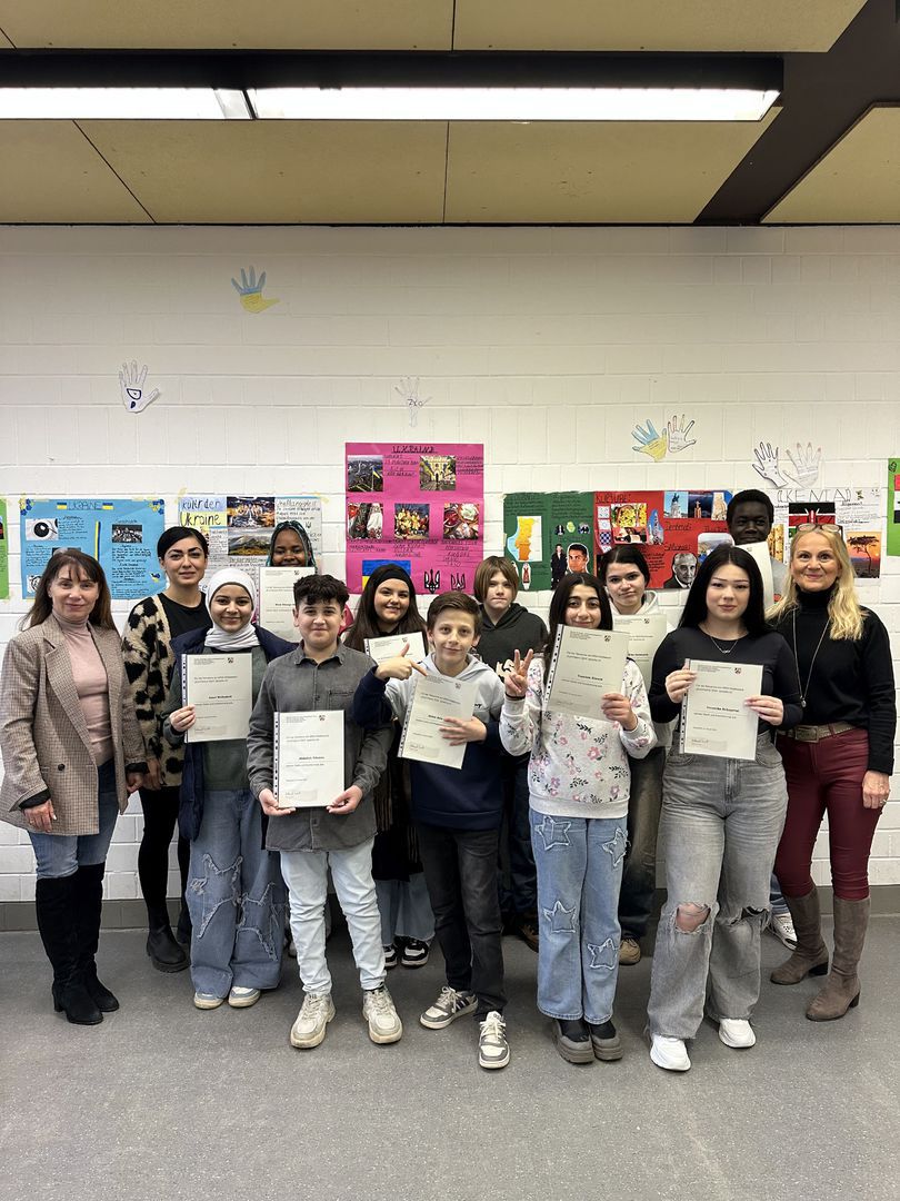 Unsere Schule hat 21 Schülerinnen und Schüler verschiedener Herkunftsländer in der sogenannten Erstförderung. Sie gehen in unsere Vorbereitungsklasse und lernen dort unter der Leitung von Afsoon Senger vornehmlich die deutsche Sprache. Im Herbst 2024 nahmen sie an dem Wettbewerb Euro-Visions teil, der seit 2006 jährlich ausgeschrieben wird. Im letzten Jahr ging es um das Thema "Starkes Europa!" und Schülerinnen und Schüler der Vorbereitungsklasse gestalteten einen Filmbeitrag, in dem sie sich persönlich vorstellten und verdeutlichten, warum ihnen ein gestärktes Europa wichtig ist. Das beeindruckende Ergebnis wurde am Tag der offenen Tür präsentiert. Für ihre tolle Arbeit konnte die Schulleitung allen beteiligten Schülerinnen und Schülern eine Urkunde des Ministeriums überreichen.
